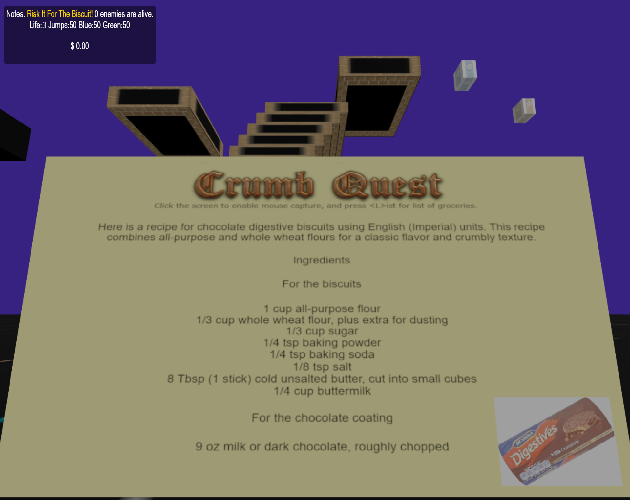 “Crumb Quest” is a first-person puzzle-shooter where every move counts. Gamble your precious bullets and limited jumps—snag a sweet advantage or lose it all. Venture through tricky levels, outwit biscuit-blocking challenges, and collect the ingredients to bake the ultimate biscuit.